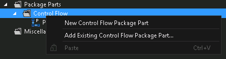 It is in this Control Flow sub-node that we get to create Package Parts by either adding an existing file-based Package Part or simply create one from scratch, as per options shown in Figure 9.