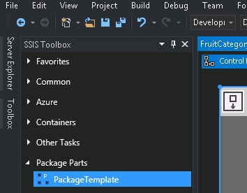 Now that we have created out Package Part, we have to add it in an SSIS Package. Unfortunately, you cannot just click and drag the Package Part from Solution Explorer into the SSIS Package’s Control Flow area, instead as soon as you have created and saved the Package Part, it will come up under Package Parts node in SSIS Toolbox, as shown in Figure 11 – wherein you can click and drag it onto the SSIS Package’s Control Flow area.