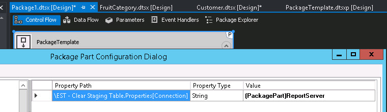 Once the connection name of PackageTemplate.dtsxp is changed to ReportServer, we can see that such a change has been applied on SSIS Packages referencing the Package Part as shown in Figure 14.