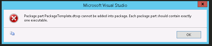 One of the things you would have noticed when we replicated the traditional package template into Package Parts was that in the Package Part we had grouped all the executables into a Sequence Container. This is because, although you can get away with adding multiple executables into a package Part without using a Sequence Container, when you attempt to add them from SSIS Toolbox you run into an error message displayed in Figure 15 as apparently Package Parts with multiple executables cannot be added into an SSIS Package.