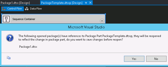 Remember how a change to the Package Part gets applied across all packages who references that Package Part, well, if one of the SSIS Packages that references the Package Part is opened at the time of editing the Package Part, then when you switch context back to that SSIS Package, you will run into a message displayed in Figure 16. It basically means that you will have to manually refresh all SSIS Packages that were opened during updating of the Package Part. So make sure that you close all packages prior to making changes to Package Parts.