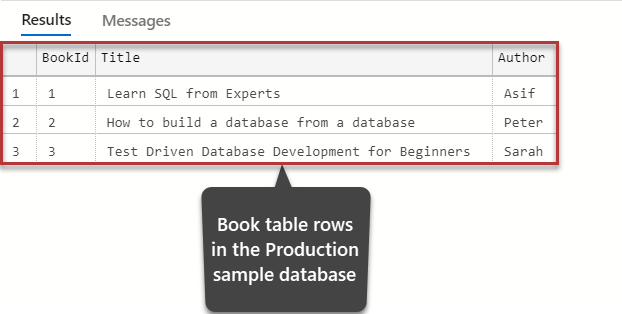 Let us view the rows in the Book table of the sample database we created to replicate the production database by running the following script against it: