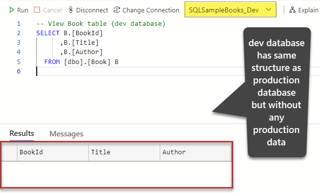 Let us view the Book table in the dev database by running the following script against the SQLSampleBooks_Dev database:
