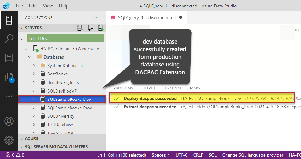 Congratulations, you have successfully created a dev database from the production database using SQL Server DAPCAC extension in Azure Data Studio.