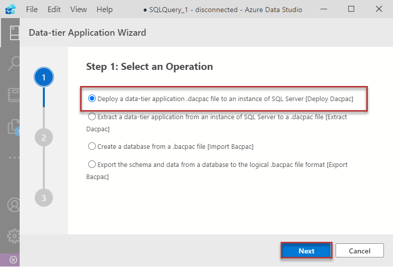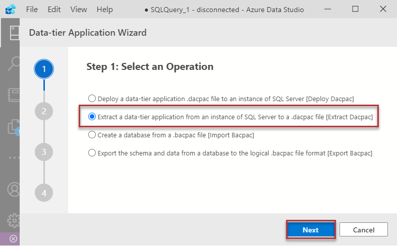 Now select the second option in the next which says Extract a data-tier application from an instance of SQL Server to a DACPAC file followed by clicking Next: