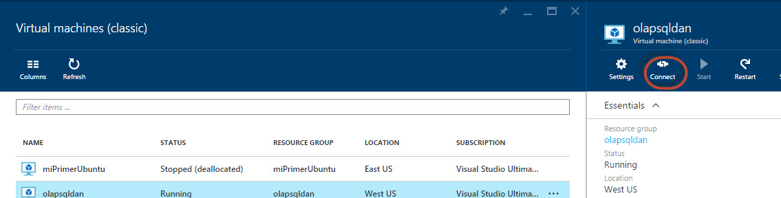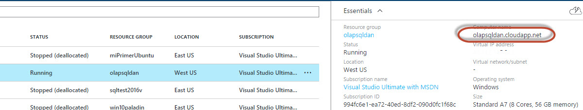 Figure 1. Virtual Machines in Azure Copy the Machine name which is also the SQL Server name (if you are using the default instance).