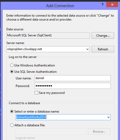 Figure 3. Adding a new connection Use the server name of the step 2, unless the SQL Server instance is not a default instance of SQL Server and specify the SQL Server Authentication user name and password. Finally, write the Database name. In this example, we will use the AdventureWorks2014 database.