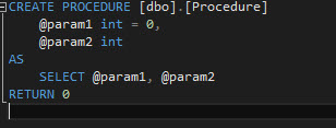 Figure 14. Stored procedure code by default In this example, we will create a stored procedure that will show the department information if we specify the name of the department. The @name will be the parameter with is the name of the department. The code will be like this: