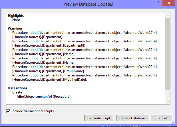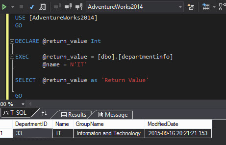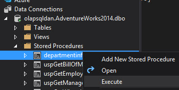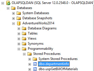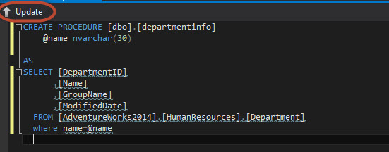 123456789101112CREATE PROCEDURE [dbo].[departmentinfo]@name nvarchar(30)ASSELECT [DepartmentID],[Name],[GroupName],[ModifiedDate]FROM [AdventureWorks2014].[HumanResources].[Department]where name=@nameThe stored procedure name is departmentinfo and the input parameter is name. It shows all the information of the department table of the database Adventureworks where the name is equal to the parameter. Once the stored procedure code is done, press update.
