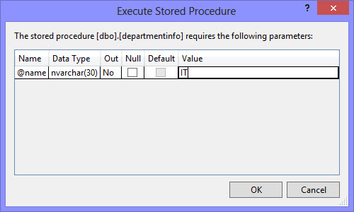 Figure 18. Executing a stored procedure In the value section specify a value. Check the step 8 to verify valid values. The stored procedure receives the Department name and returns the information of the department. In this example, we are inserting the IT name. Press OK.