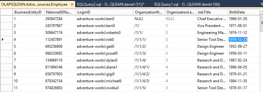 Figure 21. The table that will be used to create the function. The table contains Employees information. We will send the the function the LoginID and we want to receive the age of the employee based on the birthdate. For example, the login Adventure-works\ken0 has 46 years.