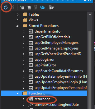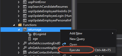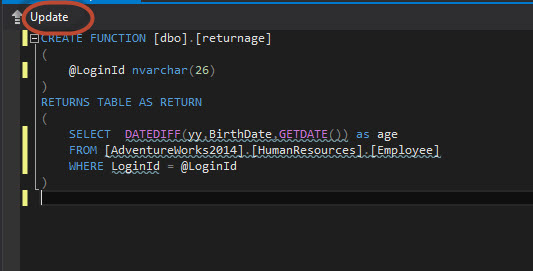 123456789101112CREATE FUNCTION [dbo].[returnage](@LoginId nvarchar(26))RETURNS TABLE AS RETURN(SELECT DATEDIFF(yy,BirthDate,GETDATE()) as ageFROM [AdventureWorks2014].[HumanResources].[Employee]WHERE LoginId = @LoginId)The Function name is returnage. It receives de loginId from the Employee table and the functions calculates the age of the employee with using the BirthDate.