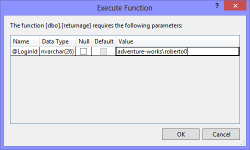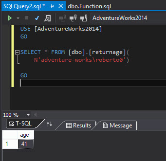 Figure 27. The function parameter specified for execution You will be able to see the function execution T-SQL code and the result. The LoginID adventure-works\roberto0 has the age of 41 years.