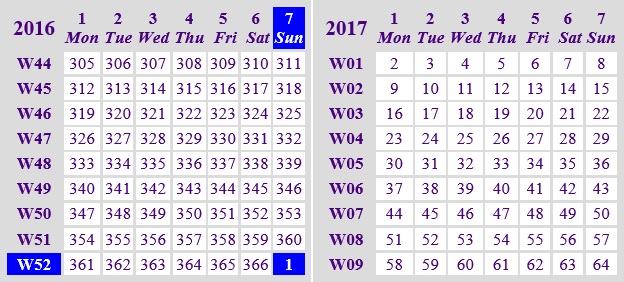 The first day of the ISO year always begins on the Monday of the week that contains January 4th, regardless of whether that date is part of the current Gregorian year or the previous one. This automatically controls leap years based on when this first week falls. The following is an illustration of the ISO calendar structure for 2016-2017: