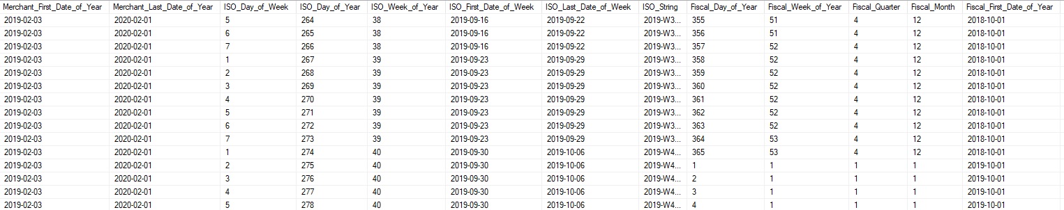 There are far too many columns to easily display here, but we now have a calendar table that contains a variety of standard date components, as well as additional ones that pertain to the merchant, ISO, and fiscal calendars.
