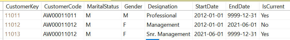 In the above customer dimension, there are two records and let us say that customer whose CustomerCode is AW00011012, has been promoted to Senior Management. However, if you simply update the record with the new value, you will not see the previous records. Therefore, a new record will be created with a new CustomerKey and a new Designation. However, other attributes will be remaining the same.