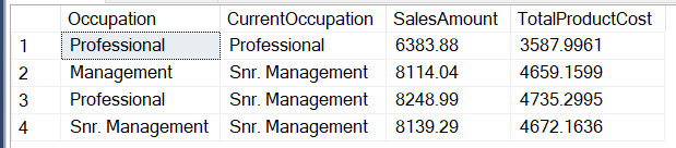 SELECT C.Occupation,C.CurrentOccupation, SUM(SalesAmount) SalesAmount,SUM(TotalProductCost) TotalProductCost FROM FactInternetSales F INNER JOIN Dim_Customer C ON F.CustomerKey = C.CustomerKey GROUP BY C.Occupation,C.CurrentOccupation |