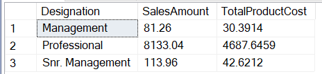 SELECT C.Designation,SUM(SalesAmount) SalesAmount,SUM(TotalProductCost) TotalProductCost FROM FactInternetSales F INNER JOIN Dim_Customer C ON F.CustomerKey = C.CustomerKey GROUP BY C.Designation |