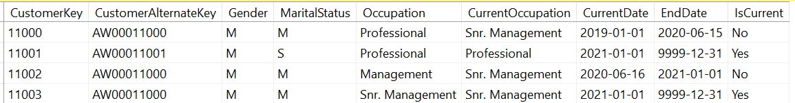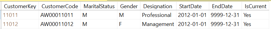 As you can see in the above figure, CustomerCode AW00011012 has a new record with 11013. All the new transactions will be related to CustomerKey 11013 while previous transactional are related to CustomerKey 11012. This mechanism helps to preserve the historic aspect of the customer as shown in the below query.