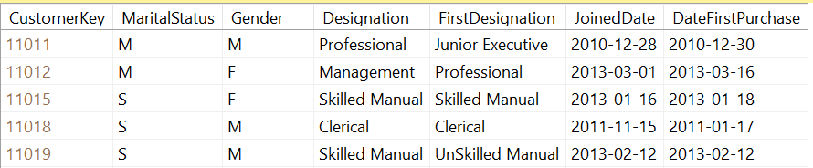 In the above Customer Dimension, FirstDesignation, JoinedDate and DateFirstPurchase are the attributes that will not be updated which is Type 0 SCD.