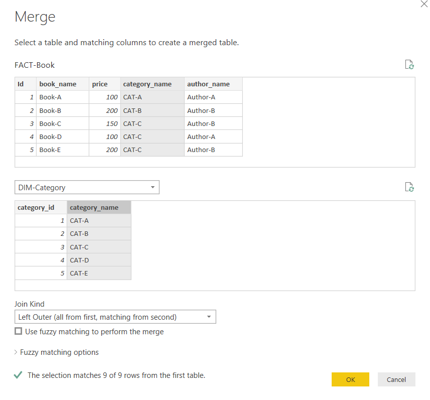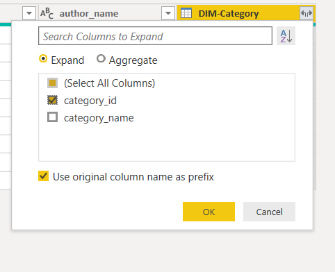 Next select the category_name column from the Fact-Book query and from the DIM-Category query, also select category_name as shown below. Click the “OK” button.