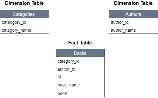 If you look at the Books table, it contains columns that can be used to retrieve data from other tables i.e. using category_id and author_name columns from the Books table, the category names, and author names can be retrieved. Since the Books table contains keys that can be used to retrieve data from other tables, the Books table is implemented as a fact table.