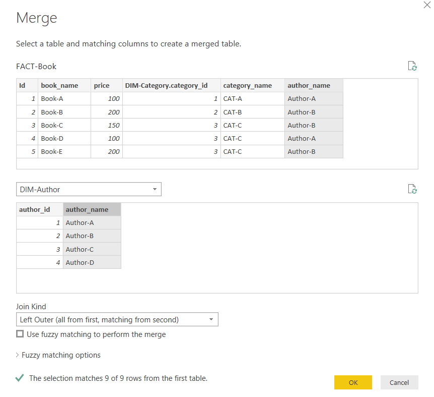 In the same way, you can merge the author_name column of the DIM-Author and FACT-Book query as shown below: