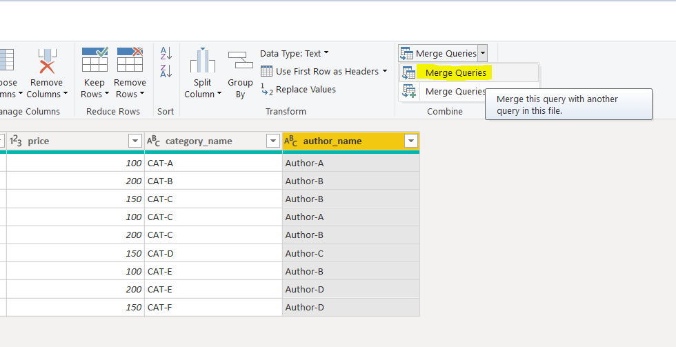 However, to make sure that the category_id and author_id columns actually refer to the category_id and author_id columns of the DIM-Category and DIM-Author queries, we will take a different approach. So click on “Merge Queries” option from the top menu as shown below: