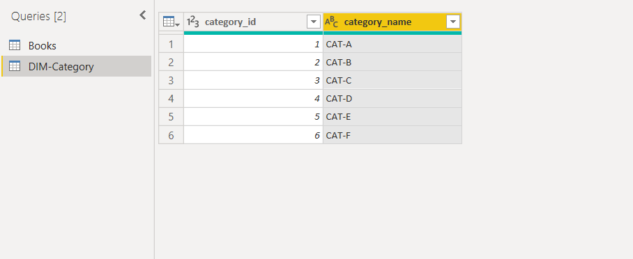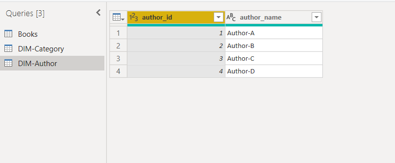 Once you remove the duplicates you should see the following query. You can see that the DIM-Category query now only contains unique ids and names of the authors.