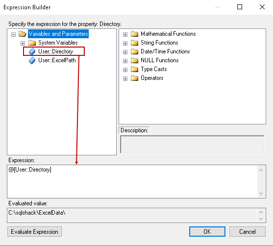 In the Expression Builder, expand the Variables and Parameters folder. Drag the variable [User:: ExcelPath] to the expression and evaluate the expression. It should show the variable value we defined earlier: