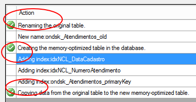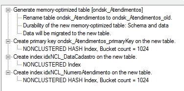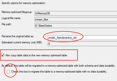 Note that the interface already renamed the actual disk table (ondsk_Atendimentos) and put on the end of his name the suffix _old. The reason for this is to facilitate the migration process by letting the name of the new In-Memory Table be the same as previous, this way the application will not be impacted and the code will not be need to be refactored to maintain compatibility.