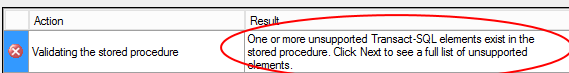 You can find the error by clicking on the Unsupported Transact-SQL Elements to be able to see the error message. Now you can open the procedure and fix the code and run again the process.