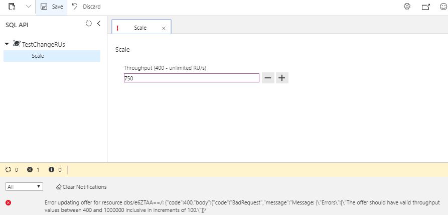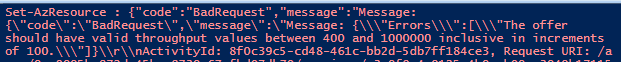 We see that the error indicates that we must use increments of 100 RUs to increase the scale. This means that we must either select 700 or 800 in this case (not 750) for our script to run successfully. We also see that we must use an RU range between 400 and 1000000, as anything below 400 or anything over 1000000 will fail. This shows that we won’t use a specification of “unlimited” in our PowerShell script if we want the highest RU specification. Notice that we get the same error if we try this in the Azure Portal: