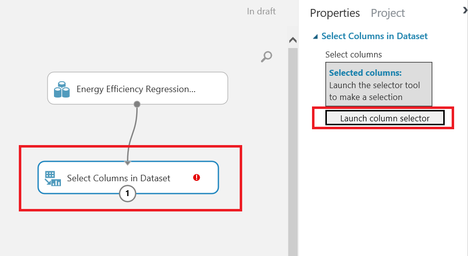 We will add sample dataset which name is “Energy Efficiency Regression Data” and then add “Select Columns in Dataset” component. This sample dataset contains cooling data and the conditions which these values are generated. Such as surface area, wall area etc.