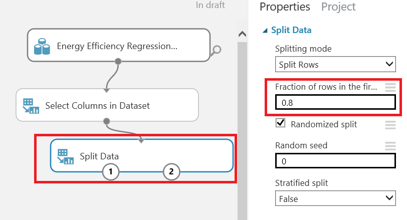 We will add “Split Data” component. This component allows us to divide dataset into training data ((training data is used as part of the machine learning process to build the model that will produce our results) and test data (test data is used to evaluate output of algorithm). We will set “Fraction of rows in the first output dataset” to 0.8. This value defines that 80% of data will be used for training and 20% of data for testing.