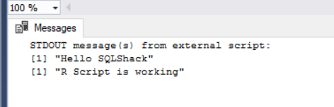 EXEC sp_execute_external_script @language = N'R' ,@script = N'print("Hello SQLShack") print("R Script is working")' |