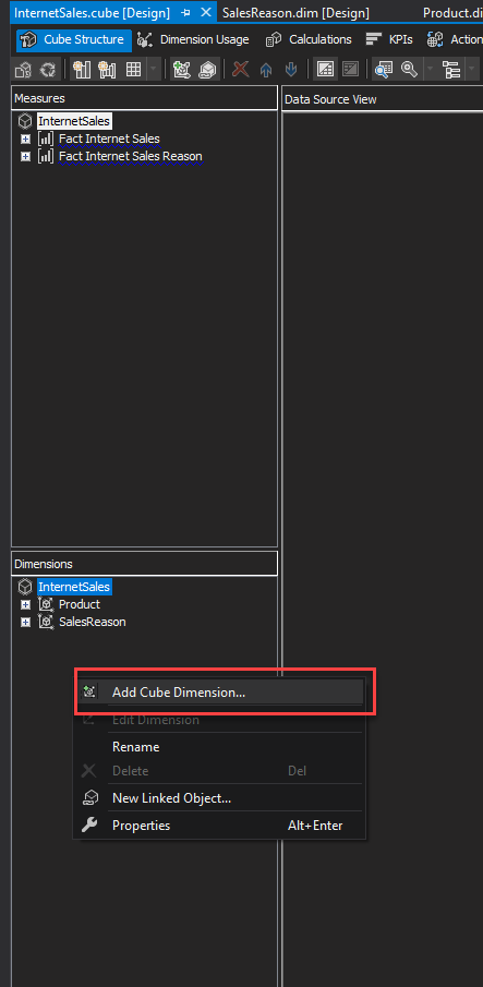 Right-click on the Dimensions and select Add Cube Dimension.