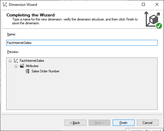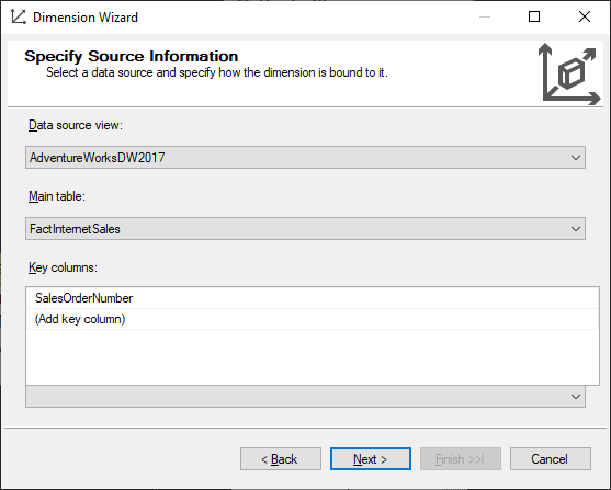 Let the key column be as SalesOrderNumber. Complete the wizard by clicking Next and finally on Finish.