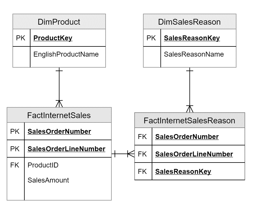 Now that we have some idea let us implement many-to-many relationships in SSAS. For demonstration purposes, I’m going to use the AdventureWorksDW2017 database as provided by Microsoft. This database is available for download free, and you can install the same on your local machine. In this data warehouse, there are also many-to-many relations, which states the reason for the purchase or sale of an item. For example, a sale can have one or more reasons linked to it and a sales reason can also be linked to multiple sales. In the warehouse, the Fact table is the “FactInternetSales” (marked in yellow) and the dimensions are “DimSalesReason” and “DimProduct” (marked in blue). Although there are many other dimensions and facts in the warehouse, it is out of scope for this article and won’t be covered here. The bridge table is created using the “FactInternetSalesReason” (highlighted in red).