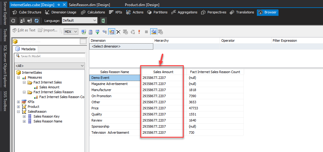 Now that our cube has been processed, let browse the cube and see what the results are. Drag and drop the “Sales Reason Name”, “Sales Amount” and “Fact Internet Sales Reason Count” fields into the query designer. As you can see in the image below, the values for the Sales Amount are the same for all the reasons which are incorrect. The reason for this error is because the many-to-many relations between the fact tables are not yet defined.