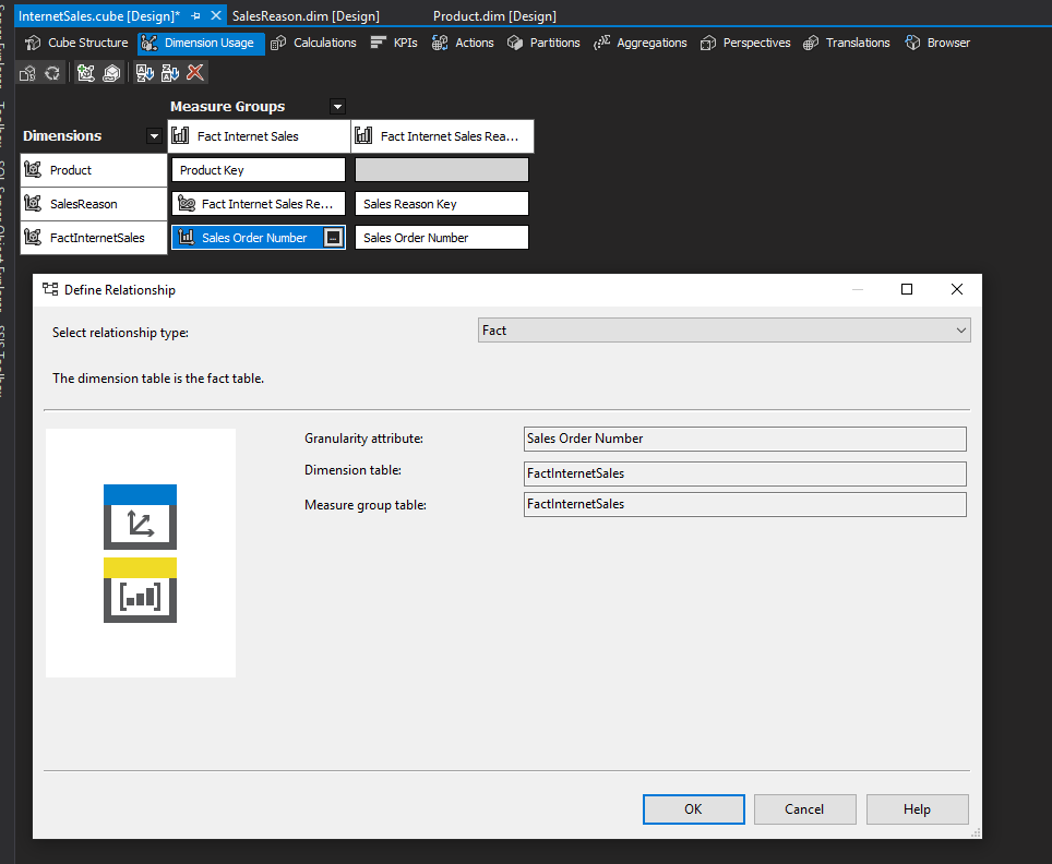 Navigate to the Dimension Usage tab, and you’ll see the new dimension now available on the list. Select SalesOrderNumber adjacent to the FactInternetSales and click on the small box on the right. In the window that opens, select the Relationship Type as Fact.