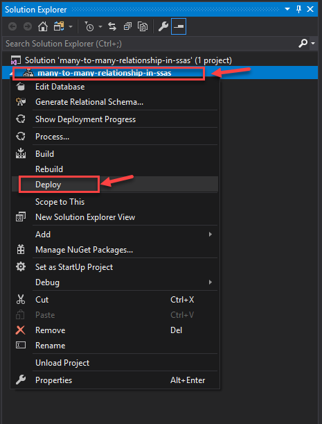 Once the cube is created, deploy the cube onto the server. Right-click the cube and select Deploy.