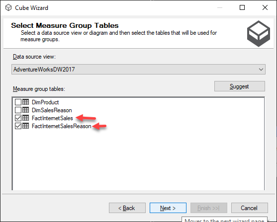 Select FactInternetSales and FactInternetSalesReason as measure groups and click Next.
