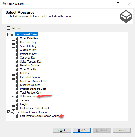 Select Sales Amount and Fact Internet Sales Reason Count as measure and click Next.