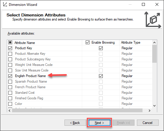 Figure 8 – Selecting Dimension Attributes for DimProduct