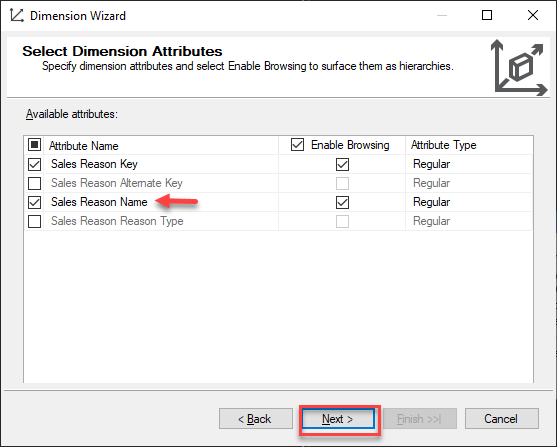 Figure 9 – Selecting Dimension Attributes for DimSalesReason