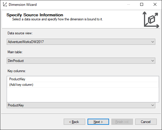 Select DimProduct as table and Product Key as the Key Column and click on Next.