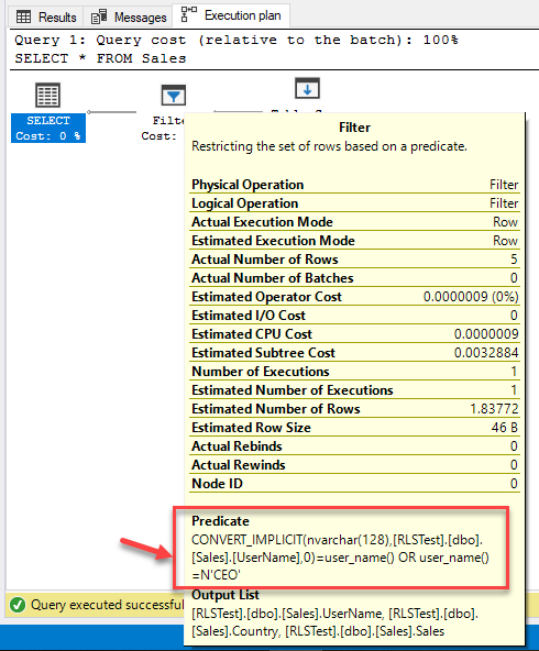 As you can see in the image above, the filter predicate that we have defined in the previous steps is being used in the query. The current username is passed as the filter to the column – “UserName”. This ensures that only the specified user will be allowed to view their respective records and all other records will be excluded from the result set.