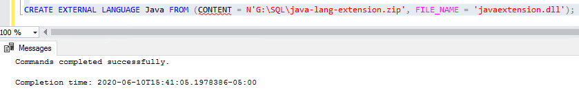 1CREATE EXTERNAL LANGUAGE Java FROM (CONTENT = N'G:\SQL\java-lang-extension.zip', FILE_NAME = 'javaextension.dll');In the following output, you can see that the Java external language registered successfully.