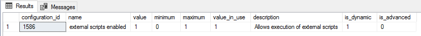 Let us re-run the aforementioned SQL to validate the “external scripts enabled” parameter